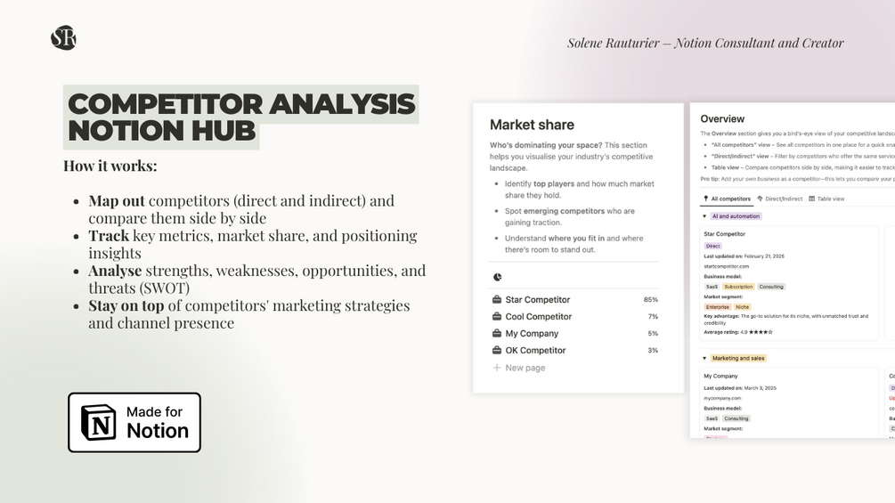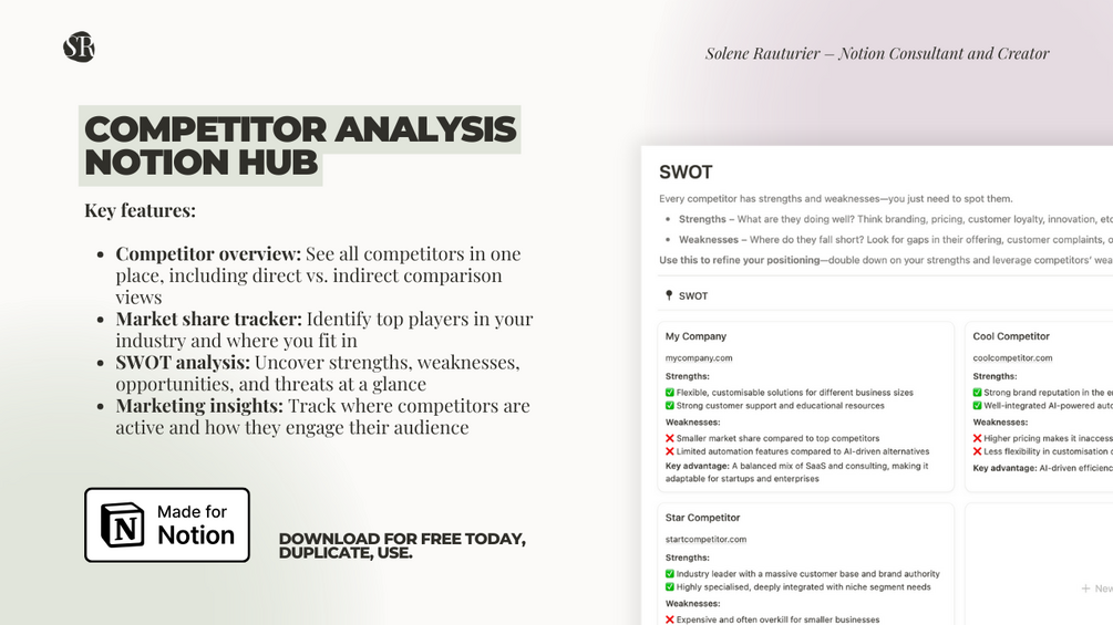 This Competitor Analysis Hub brings everything into one streamlined system, helping you track competitors, uncover strategic insights, and refine your positioning with clarity.