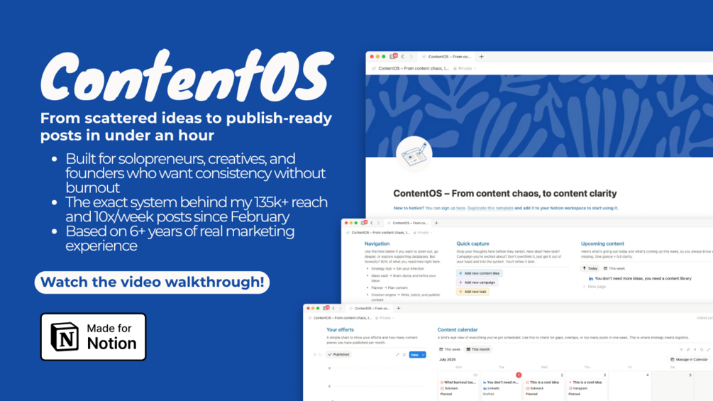 ContentOS is a ready-to-run Notion system that captures your ideas, turns them into publish-ready posts, and keeps your entire content strategy in one calm, connected space.