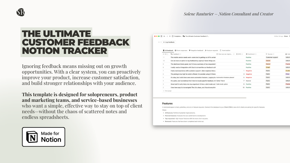 This template is designed for solopreneurs, product and marketing teams, and service-based businesses who want a simple, effective way to stay on top of client needs, without the chaos of scattered notes and endless spreadsheets.