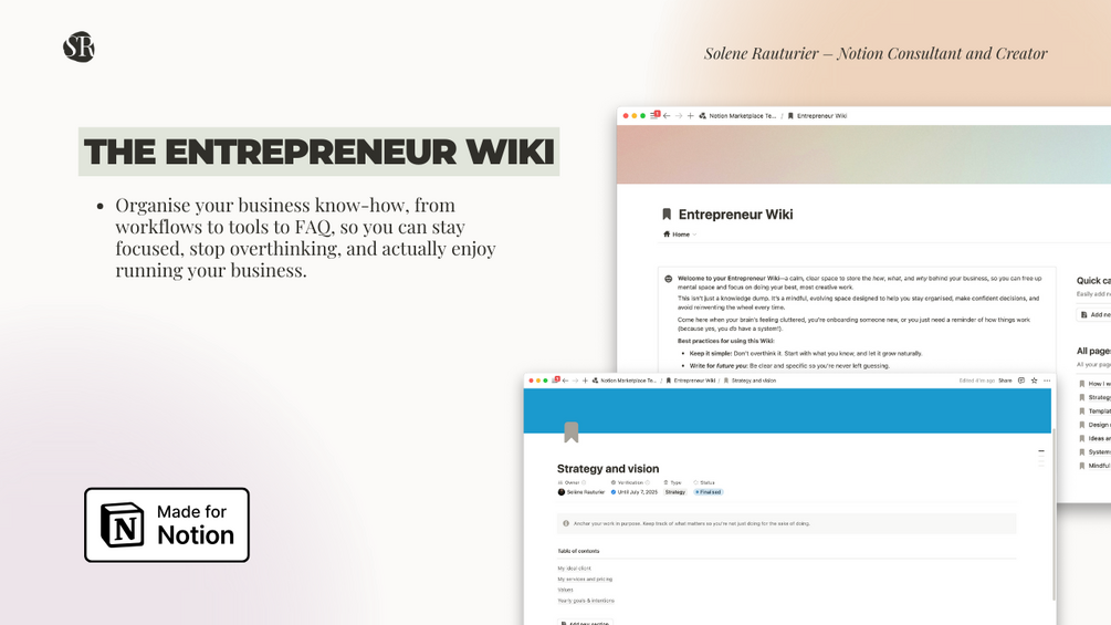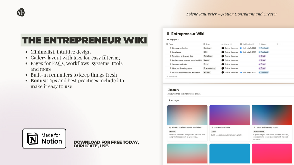 This free Notion template helps creative entrepreneurs and solo business owners build a personal business Wiki—your go-to space to document the how, what, and why behind your business.