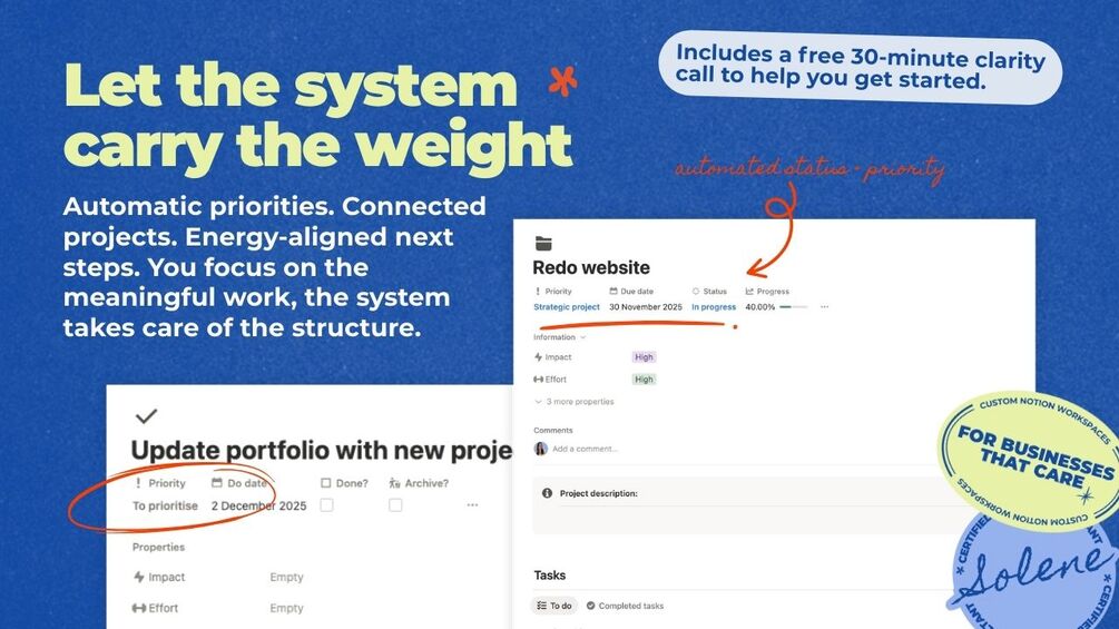 This Notion system helps you plan with intention, choose work that fits your energy, and keep everything moving without rigid productivity rules. Instead of juggling tools or guessing your priorities, you get a clear daily view of what truly matters.